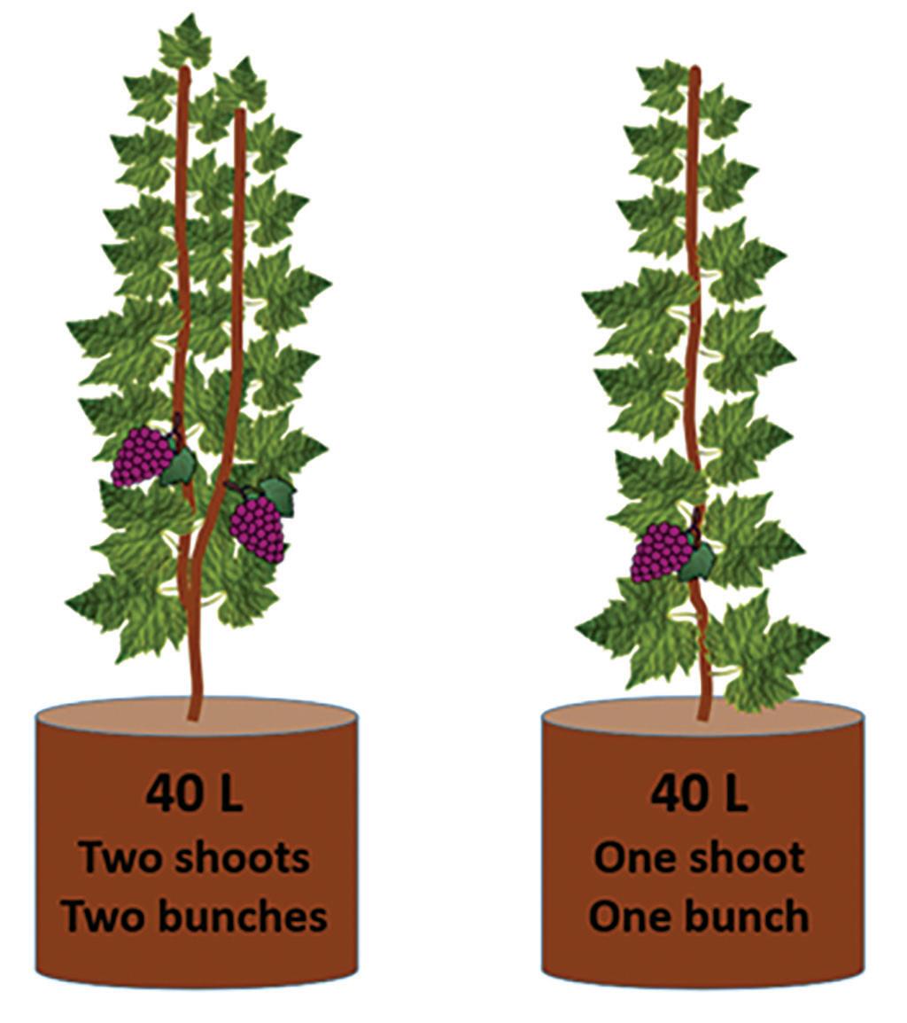 Two treatments were applied to Pinot noir vine clones, 777 and Abel grafted on rootstock 3309 on 2-year-old vines grown in 40 L pots. Vines were either pruned to retain one shoot with one bunch (1 shoot/1 bunch) or two shoots each