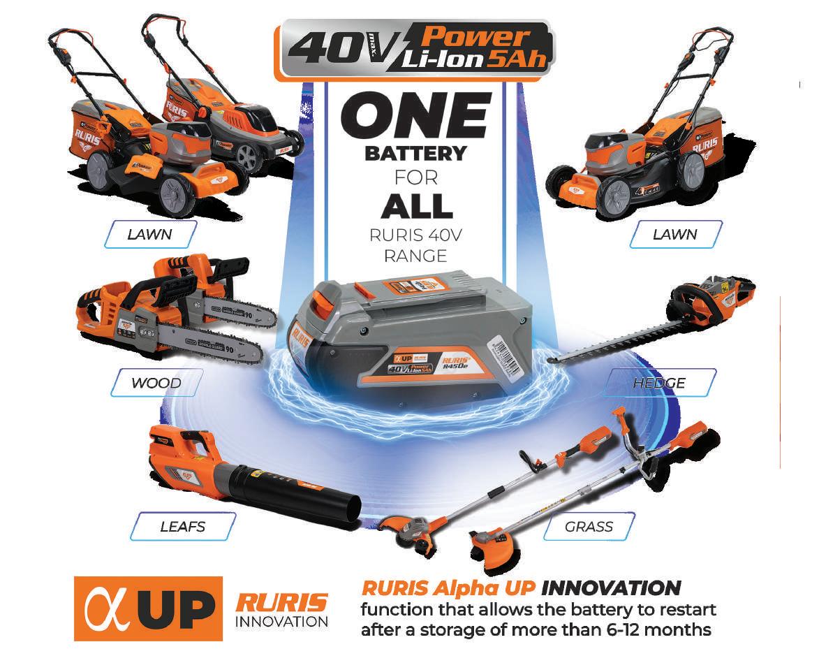 RURIS Alfa Up Innovation, brings numerous benefits to users of Li-Ion battery gardening equipment, through the function that allows the battery to be restarted after long time storage (6 to 12 months).