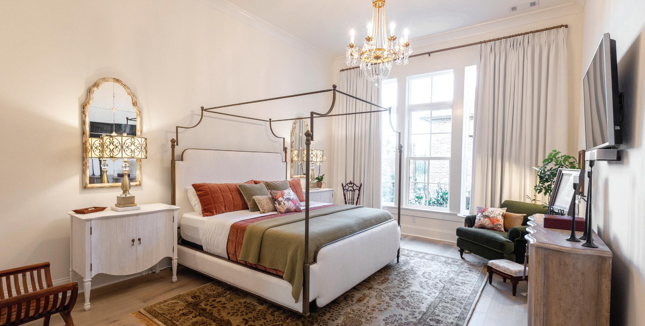 The primary and ensuite were designed to make the homeowners feel like they are retreating to a fivestar hotel, every night! The custom velvet drapes in the room block out the morning light streaming in from the courtyard. When the drapes are open they reveal the view of the gorgeous outdoor space. The drapery adds floor to ceiling softness that welcomes you in. Her closet was a labor of love for the homeowner. She had the best time designing this space to meet her exact needs. It incorporates a sliding ladder and a center island as well as a makeup vanity.