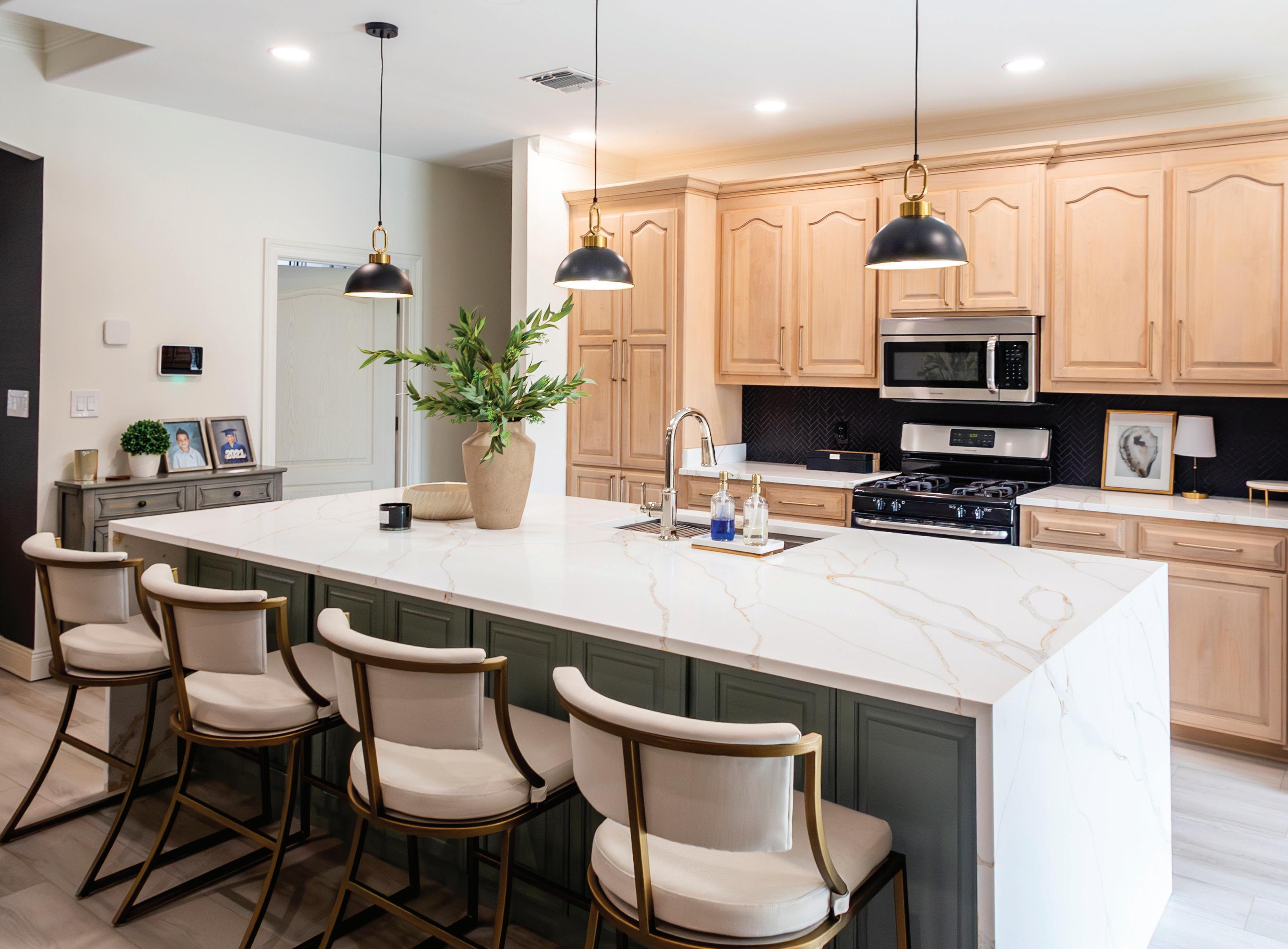 entertain friends. She also guided them in selecting new lighting, hardware, backsplash, cabinet colors, and stools, ensuring the kitchen renovation was cohesive and reflective of the Liners' style.
