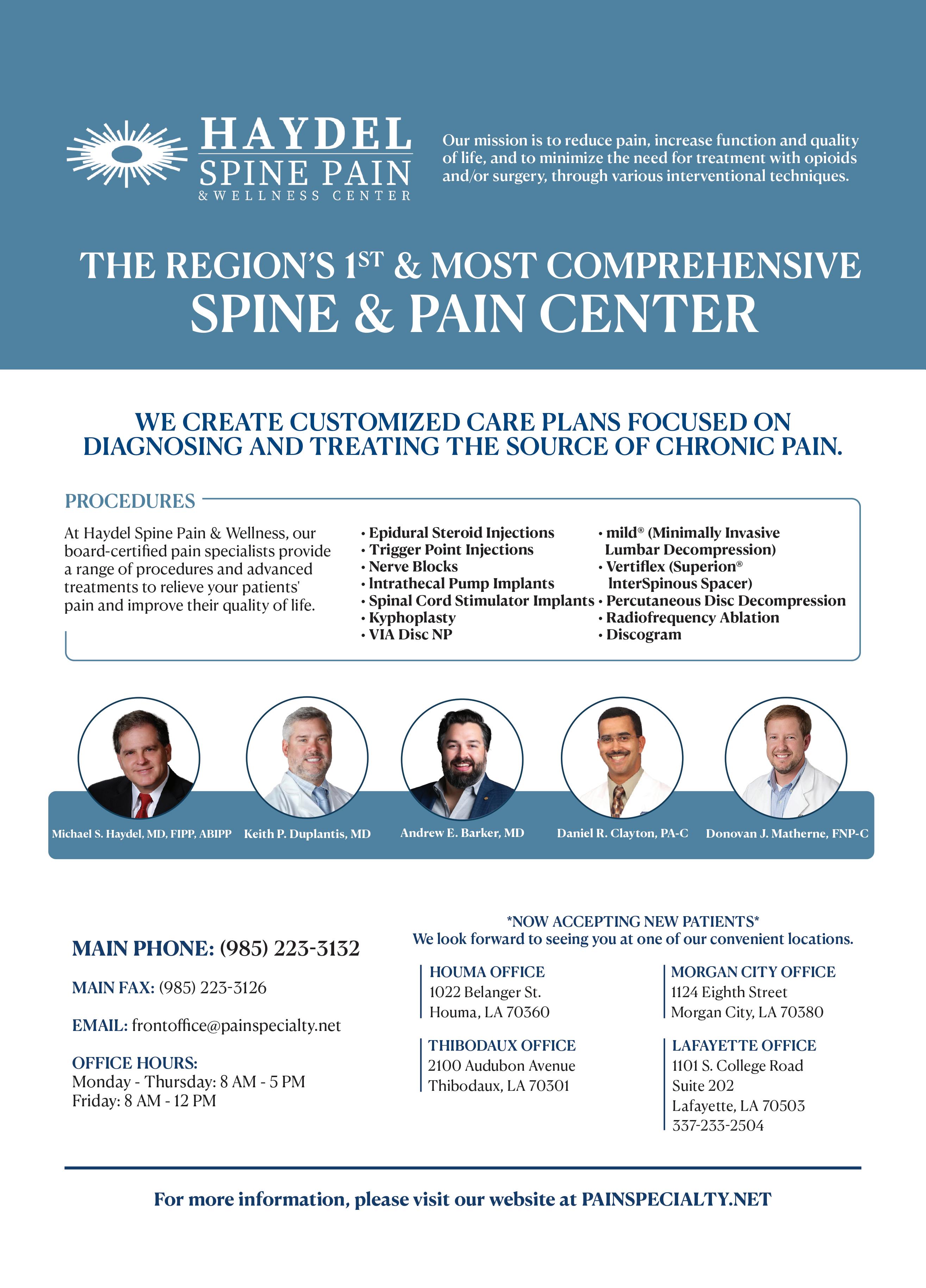 My goal is to make a meaningful impact in the Bayou Region by advancing cardiovascular care in ways that are innovative, accessible, and mission-driven. Innovation will remain a cornerstone of our work as we pioneer new treatments and technologies that elevate the standard of cardiovascular care and bring leadingedge solutions directly to our communities. Expanding access is equally important. We are focused on increasing availability to specialized heart and vascular care, reducing barriers and ensuring timely, coordinated care close to home. Community involvement and wellness will continue to guide how we serve beyond our clinics. Through free educational events, screenings, and outreach initiatives, we aim to empower patients with knowledge about cardiovascular risk factors, prevention, and early detection. Above all, we remain committed to quality and patient-centered care. By maintaining a personalized approach, we strive to set the standard for excellence while strengthening the trust our communities place in us.