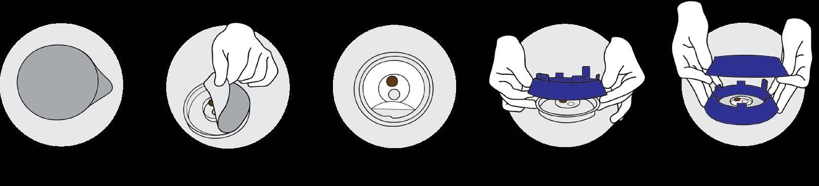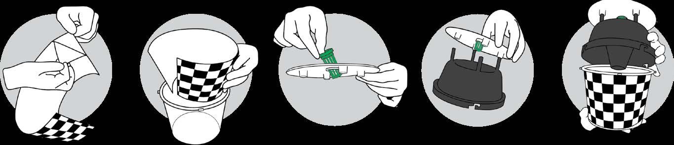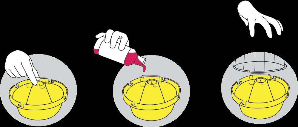 Peel the foil lid from the refill. Click the refill into the base of the trap from underneath. Line up the trap so the tether system on the base fits through the hole in the plastic lid and click together.