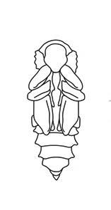 Three black spots in the middle of the face. Yellow and black horizontal stripes on body. Black stipes run to a point elongated down through the centre of each segment of the abdomen. Clear pairs of black spots running vertically down either side of the middle of the abdomen. Yellow and black striped abdomen.