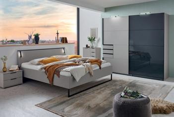 Schlafzimmer, kieselgrau/Glas weiß/ Kunstleder, Preisbeispiel für: Schrank, 3-türig, BxH: 250x217 cm, und Bett, 1 80x200 cm, in verschiedenen Größen, Farben und Zusammenstellungen erhältlich. Zubehör gegen Mehrpreis, 201494/2/4
