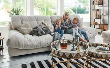 Sedežna garnitura, tkanina/žamet, krem barve, vklj. 3 hrbtne blazine in 2 okrasni blazini, mere: 173x276 cm, na voljo v različnih postavitvah in barvnih kombinacijah. Nasloni za glavo za doplačilo, 204299