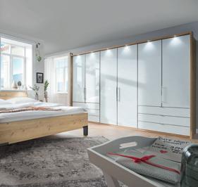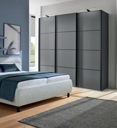 Spalnica, grafit/Bianco hrast, cenovni primeri za: 5-delno omaro, ŠxVxG: 250x216x58 cm, in posteljo, 180x200 cm, vklj. s panelom in policama iz zatemnjenega stekla, na voljo v različnih barvah in velikostih. Dodatki so za doplačilo, 201757/3/4