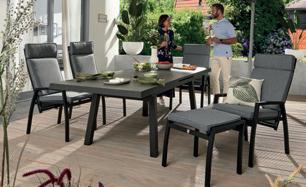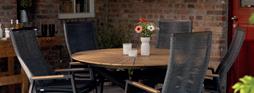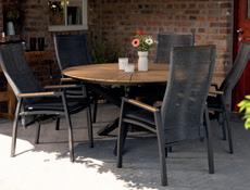 Miza, aluminijasto ogrodja, 4-noge, antracit, plošča iz tikovine, ø: 140 cm, višina: 75 cm, 203093 Stol, naslon za roke iz tikovine, aluminijasto ogrodje, antracit, tekstilen, naslon iz vrvi, antracit, vklj. blazina iz blaga Sunbrella, barva: Sooty, ŠxGxV: 63x57x107 cm, namesto 279,99 zdaj 222,-, 203093/1, z nasloni za roke iz tikovine, ŠxGxV: 66,5x57x107 cm, 203093/2