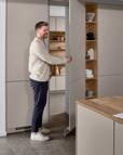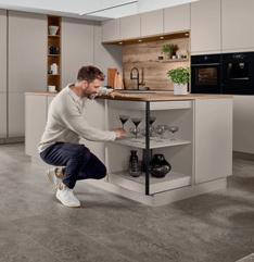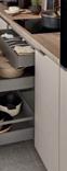 Inovativni FurnSpin odpira povsem nove možnosti oblikovanja in kuhinjskemu pohištvu daje občutek dinamike. Z nežnim vrtilnim gibom se celotna vsebina omarice elegantno zavrti navzven. Police in notranji elementi postanejo popolnoma vidni in lahko dostopni. Z dodatnim zasukom se vsebina znova