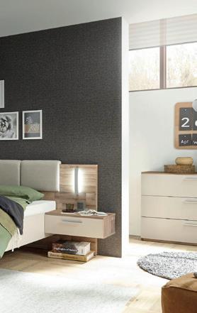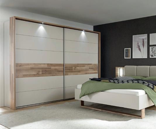 Spalnica, barva šampanjca/Montana Oak, cenovni primer za: 2-delno omaro, ŠxVxG: 270x210x60 cm in posteljo 180x200 cm z oblazinjenim vzglavjem, vzglavni paneli z osvetljavo, par nočnih omaric, ŠxVxG: 60x19x38 cm z 1-predalom. Dodatki so za doplačilo, 197145/0/1 699,-* 399,–