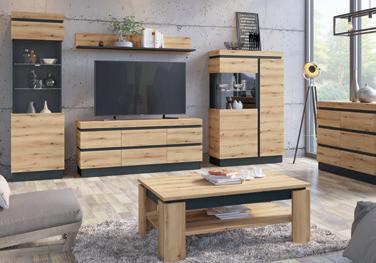 Korpus in predali v dekorju imitacije hrasta Trentino, fronta iz stekla v peščeni barvi, ročaji/dekorativni trakovi v ozki grafitni izvedbi. LED-osvetlitev Jetline v grafitni barvi.