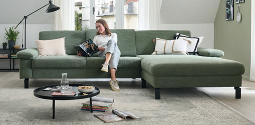 Sedežna garnitura, tkanina/žamet, olivna barva, noge: mat/črne, sedež: vzmetno jedro, vklj. z zložljivimi nasloni za roke, mere: 304x185 cm, na voljo v različnih postavitvah in barvnih kombinacijah. Posteljna funkcija, nasloni za glavo in blazine za doplačilo, 201455/1