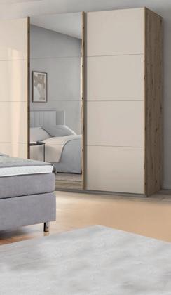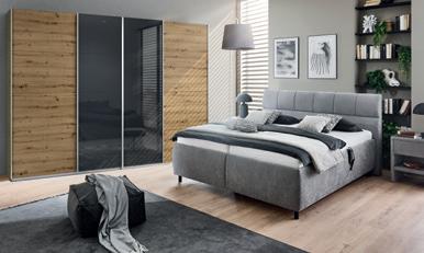 Postelja, blago: srebrno sivo, 180x200 cm, vzglavje: prevlečeno z blagom, prostor za shranjevanje, vklj. z električno nastavljivim letvenim dnom z masivnim okvirjem ter 7-consko vzmetnico iz hladne pene z elastično dvojno prevleko, zadrgo in 4 ročaji, na voljo v različnih velikostih, barvah in izvedbah. Pregrinjalo, blazine ter nočne omarice za doplačilo, 184595/11. Omara, 4-vratna, hrast Artisan/steklo basalt, ŠxVxG: 316x230x62 cm, na voljo v različnih barvah in velikostih. Dodatki so za doplačilo, 197840/1