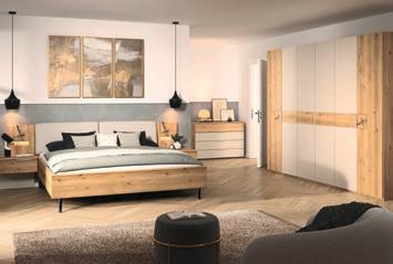 Spalnica, šampanjec/aspen hrast, cenovni primer za: omaro, 6-delna, zunanja vrata, trak iz masivnega lesa, ŠxVxG: 301x223x61 cm, in posteljo, 180x200 cm, oblazinjeno vzglavje, na voljo v različnih velikostih in barvah. Dodatki so za doplačilo, 203626/0/5