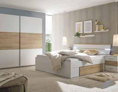 LETTO MATRIMONIALE 180X200 CM CON DUE COMODINI, colore: bianco/rovere, testiere del letto con illuminazione LED, incl. 2 cassetti estraibili sotto letto, misure: 215x185 cm, 201177/1, ARMADIO CON ANTE SCORREVOLI, colore: bianco/rovere, numero ante: 2, misure: 215x210x60 cm, 201177