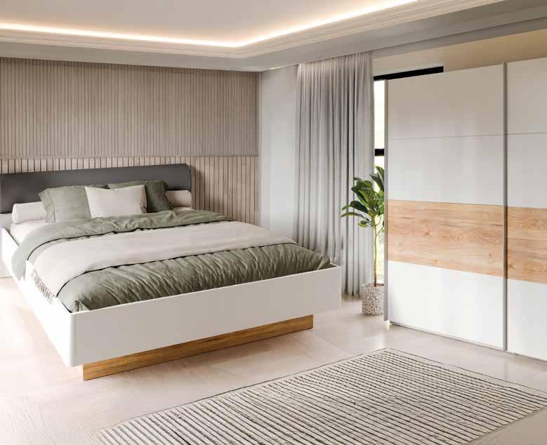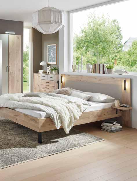 SPALNICA, barva: hrast/siva, sestavljena iz omare, ŠxVxG 225x208x58 cm, postelje 180x200 cm, z LED osvetljavo (energijski razred F), dodatno pohištvo za doplačilo, 203590