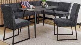 MIZA, videz lesa, temno ogrodje: kovinsko črno, mere: 120x70 cm, 203337. STOL, tkanina, sivo-modra, kovinsko ogrodje: črno, sedežna višina: 48 cm, ŠxVxG: 47x92x62 cm, 203337/2. KOTNA KLOP, tkanina, sivo-modra, kovinsko ogrodje: črno, mere: 154x200 cm, zdaj 599,-, 203337/1