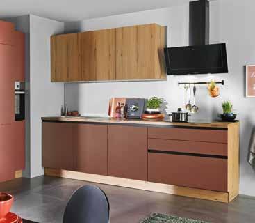 KUHINJA, barva: rdeča/hrast, 150x280 cm, na voljo v različnih postavitvah in barvnih kombinacijah. Vgradni aparati ter pomivalno korito za doplačilo, 204701/0