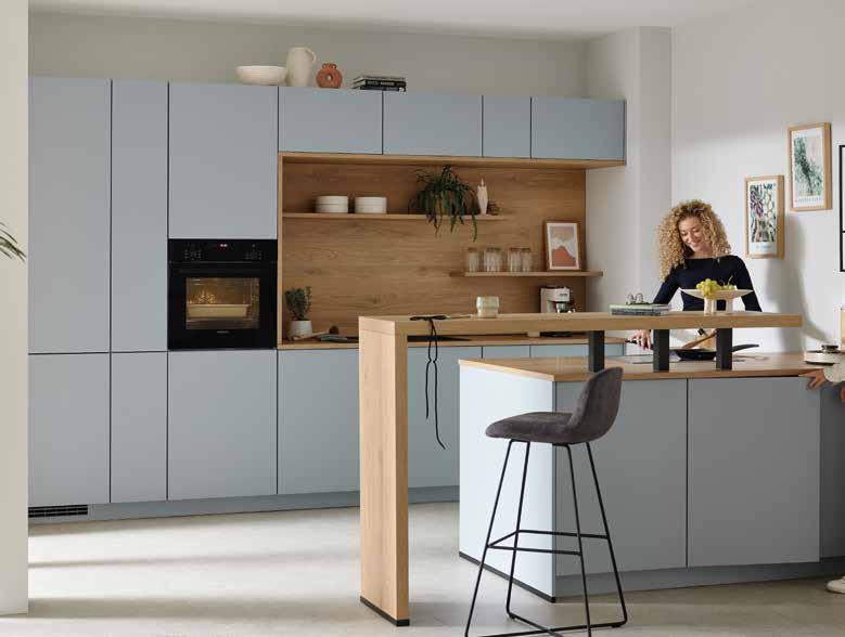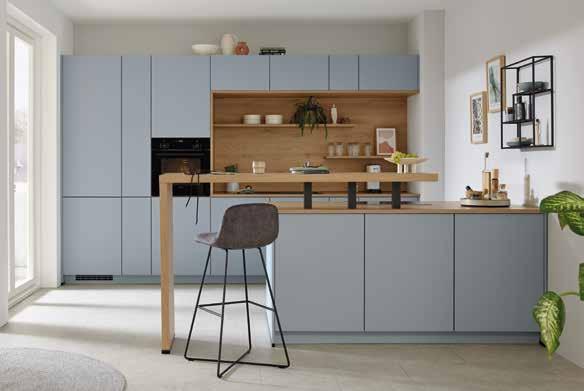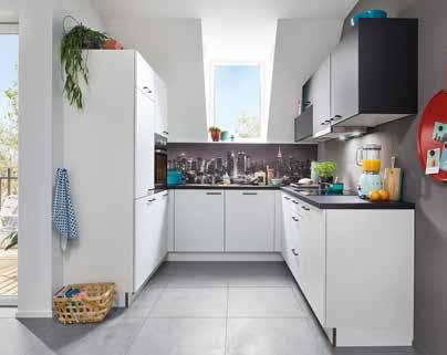 KUHINJA, barva: Sky lakirano mat, ca. 363 cm + 180 cm + 90 cm (miza), na voljo v različnih postavitvah in barvnih kombinacijah. Vgradni aparati ter pomivalno korito za doplačilo, 204865