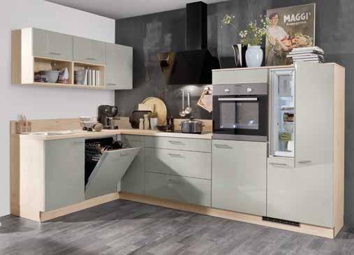 KUHINJA, svetlo sivo lakirana, visoki sijaj, 305x185 cm, na voljo v različnih postavitvah in barvnih kombinacijah. Vgradni aparati ter pomivalno korito za doplačilo, 204702