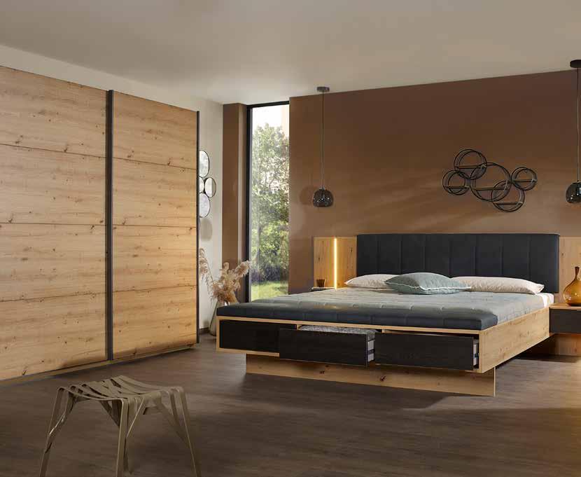 OMARA Z DRSNIMI VRATI, hrast/grafit, 2-vratna, passepartout za doplačilo, mere: 270x210x60 cm, 194793/1. POSTELJA, hrast/grafit, ležalna površina: 180x200 cm, vklj. 2 nočni omarici in oblazinjeno vzglavje, mere: 297x212 cm, 194793/2