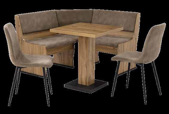 SET DA PRANZO, in colore rovere con rivestimento in tessuto marrone, composto da: 1x tavolo LxAxP: 65x76x65 cm con base inferiore nera, 2x sedie con struttura in metallo di colore nero, 1x panca angolare LxAxP: 131x86x131 cm con vano contenitore integrato, 204372