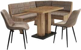 SET DA PRANZO IN COLORE ROVERE CON RIVESTIMENTO IN TESSUTO MARRONE, composto da: 1x tavolo LxAxP: 65x76x100 cm con base inferiore nera, 2x sedie con struttura in metallo di colore nero, 1x panca angolare LxAxP: 171x86x131 cm con vano contenitore integrato, 204373