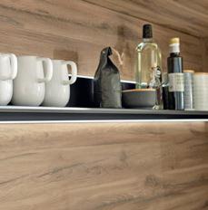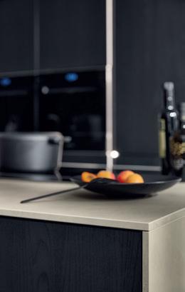 1 Dodatno ojačana delovna plošča iz imitacije vulkanskega hrasta deluje dekorativno in smiselno ločuje kuharski od pomivalnega dela.
