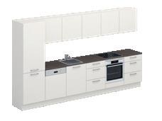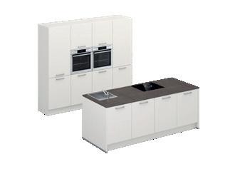 Posebnost te kuhinje je kombinacija dveh različnih mat lakiranih front. Tukaj se srečata sodoben dizajn in brezčasna eleganca. Medtem ko številni detajli front spominjajo na podeželski slog, visoke omarice s sodobno ravnimi linijami zagotavljajo harmoničen kontrast. V povezavi z delovno površino v betonsko beli barvi nastane sodoben in brezčasen celosten videz. Najboljše: to kuhinjo lahko oblikujete v 19 drugih barvah iz naše barvne palete – povsem po vašem okusu.