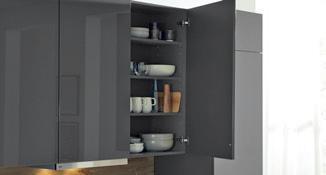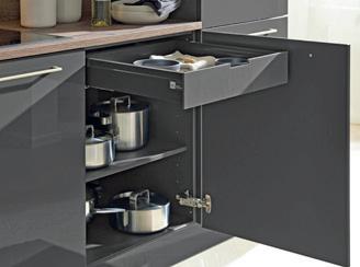Izvlečni predali ponujajo popolno organiziran prostor za shranjevanje do širine 1200 mm. Zaradi globine 750 mm je na voljo 32 % več prostora za shranjevanje v primerjavi s standardnimi spodnjimi omaricami. In to z le 150 mm več potrebnega prostora ob steni.