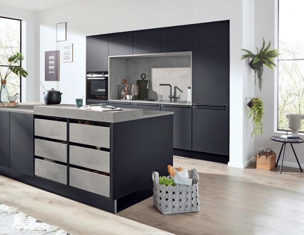 Kuhinja Interliving, serija 3047, očara že na prvi pogled s svojo prefinjeno in ekstravagantno pojavnostjo ter izvrstno zasnovo, ki združuje velik kuhinjski otok in vgradno omaro. Sodoben dizajn vabi k temu, da vsak dan preživite veliko časa z družino in pripravljate okusne jedi. Vizualno navdušuje elegantna kombinacija front v mehki mat črni barvi in trendovskem odtenku betona, v katerem so oblikovane tudi delovne plošče, obloge niš in točilni pult.