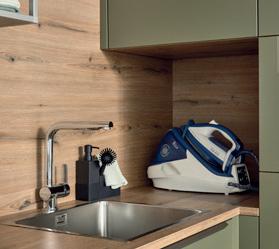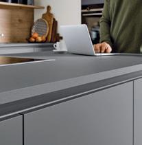 Kakšen gospodinjski prostor bi si želeli? To je seveda povsem odvisno od vašega prostora in vaših želja. S svojim elegantnim dizajnom, pametnimi funkcijami in pralnim strojem, vgrajenim na optimalni delovni višini, ta serija ustvari prostor, kamor lahko shranite tudi vsa čistilna sredstva. Vizualno kuhinja navdušuje z elegantnimi frontami v barvi cementnega safirno sivega odtenka, kombinirana s korpusom v kremenčevo sivi barvi.