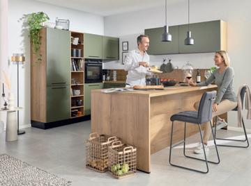 Prestižna, izvirna in premišljeno načrtovana – to je kuhinja Interliving, serija 3059. Oznanilna nova barva front v črno zeleni s poudarki v črni in beli barvi ter praktičnim dodatnim pultom vabita k kuhanju in uživanju. Črni kovinski regali v industrijskem slogu nudijo idealen prostor za pogosto uporabljane predmete, kuharske knjige ali dekoracijo.