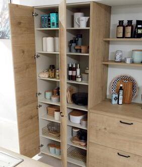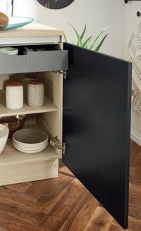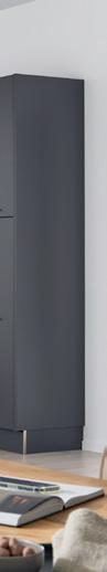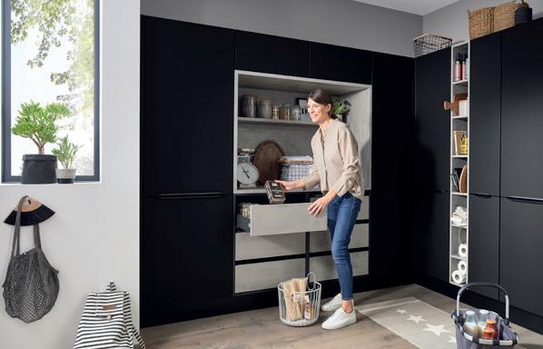 Shramba Interliving, serija 3073, je odlična rešitev za vse, ki se tudi v svoji shrambi ne želijo odreči kakovosti, praktičnosti in privlačnega videza. S svojim elegantnim dizajnom, pametnimi funkcijami in obilico prostora za shranjevanje živil, pijač, kuhinjskih krp in čistilnih pripomočkov poskrbi za odlično organizacijo. Vizualno navdušuje z elegantno kombinacijo front v mehki mat črni barvi s površino, kjer se prstni odtisi ne vidijo in odtenki betonske barve.