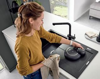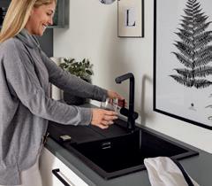 1 Ekskluzivno vgrajeno pomivalno korito in armatura v elegantni črni barvi navdušujeta z odličnimi materiali in purističnim dizajnom.