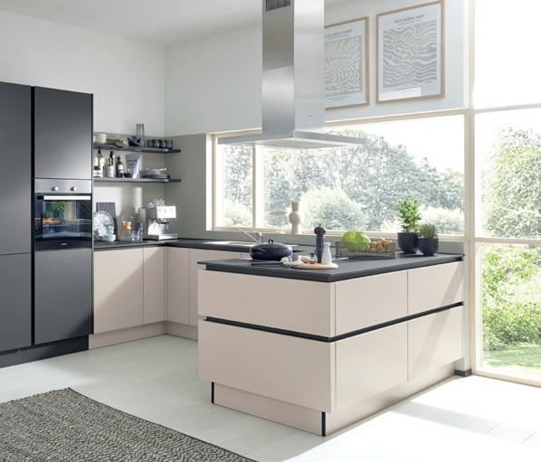 Interliving kuhinja, serija 3060, povezuje sodobno udobje in inovativno načrtovanje kuhinje v obliki črke U v harmonično kuhinjo, ki je hkrati tudi bivalni prostor. S kontrastno barvno kombinacijo iz Sahare in kvartsko sive barve je ta kuhinja posebej vabljiva. Široke police v kvartsko sivi barvi nad pomivalnim elementom lahko napolnite z dekoracijo, kuharskimi knjigami ali podobnim, kar vam srce poželi.