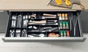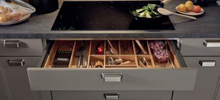 „Na področju notranje organizacije nas je ponudba popolnoma prepričala: od protizdrsnih podlog do prilagodljivih razdelkov za pribor in pripomočke iz plastiki ali celo pravega lesa – ni želje, ki se je ne da izpolniti. Odločili smo se za različico v pravem hrastu in svojo kuhinjo popolnoma opremili – tako ima vse svoj trden prostor, predali in izvlečni elementi pa so popolnoma organizirani. Odtenek hrasta se odlično ujema s kremenasto sivo na sprednjih delih.“