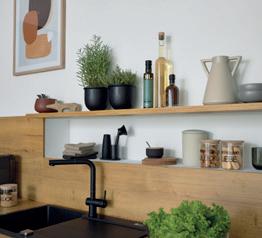 3 Kombinacija z modernim lesenim odtenkom v kamnitem hrastu regalnim elementom in delovni plošči doda živahne poudarke.