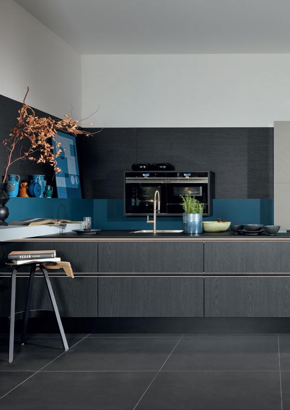 Kuhinja Interliving, serija 3061, navdušuje s svojimi brezkompromisno ravnimi linijami in izjemnim prostorom za shranjevanje. Vizualno prepričajo sprednje površine v visokem sijaju grafitnega laka, v kombinaciji z odtenkom v barvi lesa Castell.