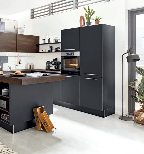 Kuhinja Interliving, serija 3031, očara s svojim izjemnim dizajnom in izjemno funkcionalno zasnovo. Korpusi, fronte in podnožje kuhinjske linije so oblikovani v puristični črni barvi z mehko mat površino, ki je odporna na prstne odtise. Poudarjajoča elementa sta viseča omarica z dvižnimi vrati ter delovna površina in pult v privlačni imitaciji oreha Kuba. V kombinaciji te barve ustvarjajo posebno, šarmantno vzdušje. Med vrhunce serije poleg praktičnega pulta spadajo tudi odprti regali in police.