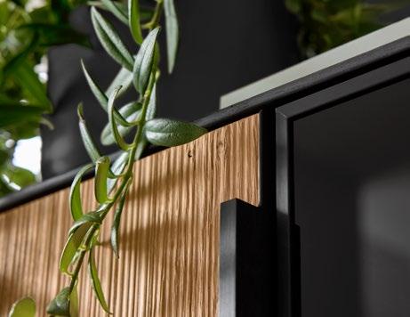 Das raumteilende Kochelement beherbergt sowohl innenseitig durch seine übersichtlichen Vollauszüge als auch außenliegend sehr viel Stauraum. Die praktischen Lifttüren mit edlem Glaseinlegeboden schließen dank des Softeinzugs sanft und lautlos. Die nach oben zu öffnenden Kurzhänger bieten reichlich Stauraum auf Augenhöhe.