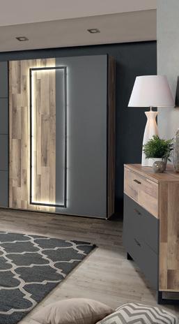 Korpus und Schubkästen Dekor Trentino Eiche Nachbildung, Front Sandglas, Griff-/Zierleisten schmal graphit. LED-Beleuchtung Jetline in graphit.