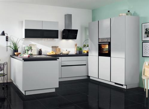 Küche, Schwarz matt, ca. 180+240 cm, inkl. aller angeführten Edelstahl Einbaugeräte, in verschiedenen Zusammenstellungen und Farbkombinationen erhältlich. Geschirrspüler sowie Spüle gegen Mehrpreis, 203646/195004