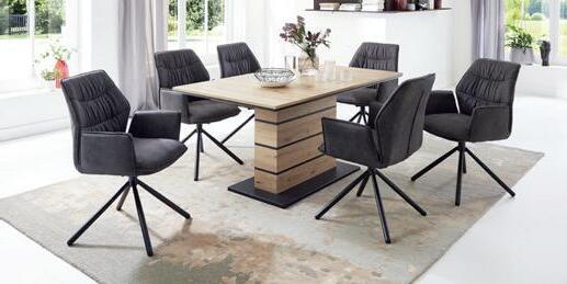 Stuhl, Stoff, anthrazit, Metallgestell: schwarz, um 180° drehbar, 193101/1 Tisch, Struktureiche Dekor, Bodenplatte: schwarz, ausziehbar, Maße: 160(240)x90 cm, 194740