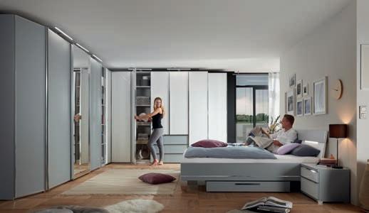 Schlafzimmer, kieselgrau/Glas weiß/ Kunstleder, Preisbeispiel für: Schrank, 3-türig, BxH: 250x217 cm, und Bett, 180x200 cm, in verschiedenen Größen, Farben und Zusammenstellungen erhältlich. Zubehör gegen Mehrpreis, 201494/2/4