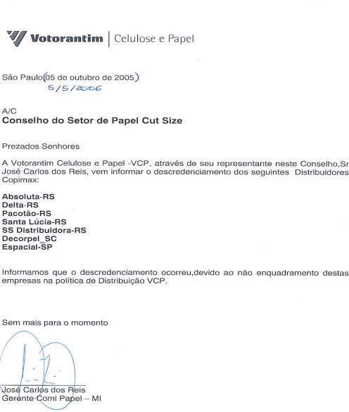 O assunto vem sendo discutido no âmbito do Conselho e envolveu os quatro fabricantes e a Bracelpa. A VCP foi a primeira a oficializar sua posição conforme correspondências reproduzidas a seguir. Em resposta oficial à VCP e em reunião do CCS, a ANDIPA apresentou sua compreensão e concordância que é importante a defesa dos interesses do setor de papel sem infringir o direito concorrencial, ou quaisquer outros ramos do direito brasileiro.