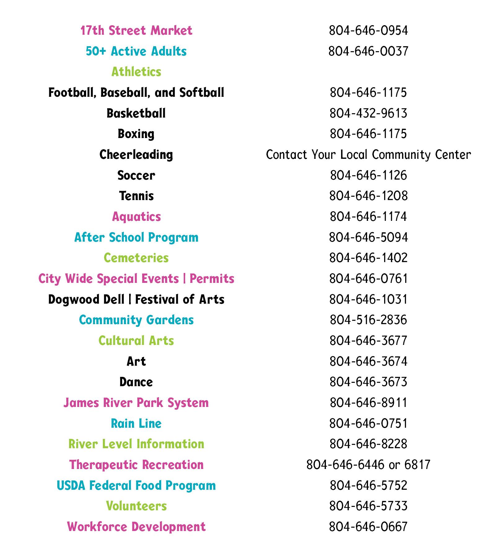 To request a modification based on the Americans with Disabilities Act (ADA), please contact the Therapeutic Recreation office at 804-6466446 or 804-646-6817.