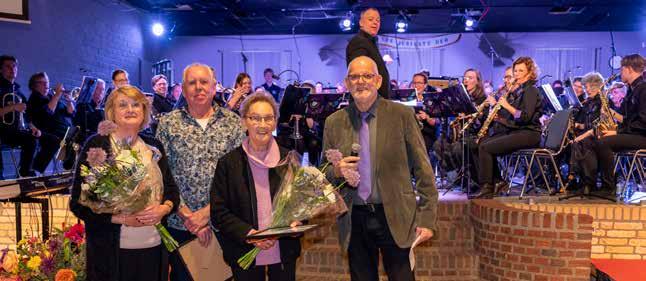 Bij een nieuwjaarsconcert hoort traditiegetrouw de huldiging van jubilarissen. Dit jaar hadden we er twee: dhr. Henk Thijssen, zestig jaar lid en mevr. Nelly van Bentem die vijfentwintig jaar lid is. Zij kregen de bloemen die bij deze mijlpalen horen en een oorkonde. Gelukkig kan de fanfare zich omringen met een fijne groep leden, vrienden en donateurs.