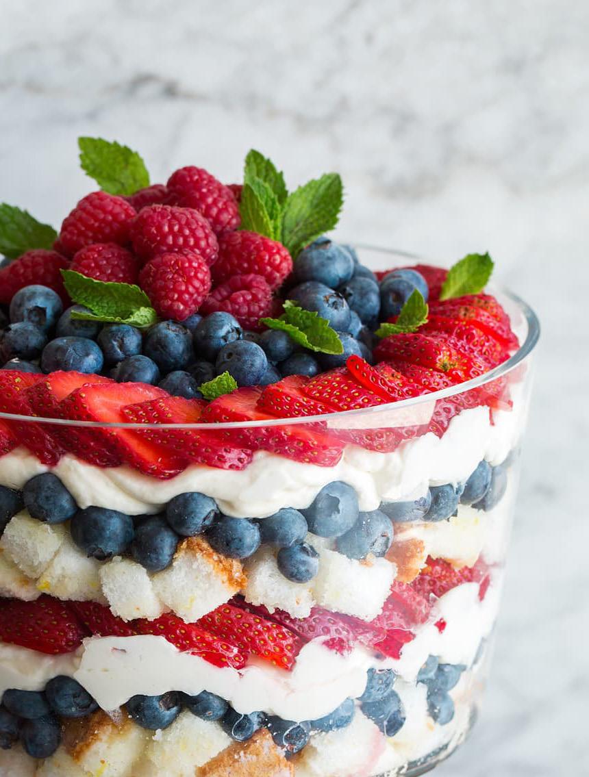 Place half of the cake pieces in a large trifle bowl. Top with half of the custard. Add half the berries, then spoon half of the cream over the top. Repeat to use up all of the ingredients.