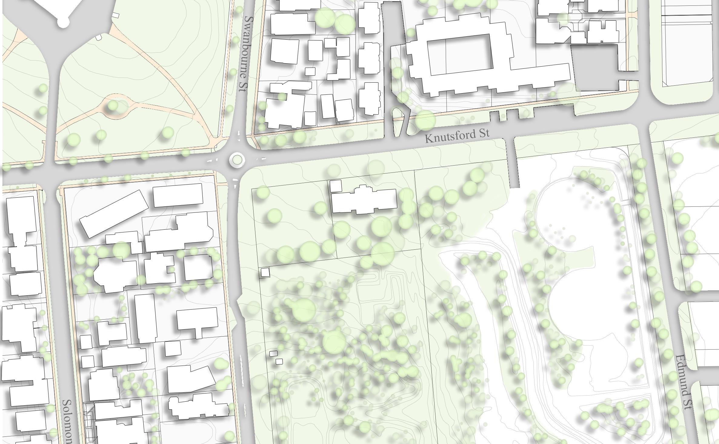 In this stage Knutsford st road way would be realigned adjacent to new developments. Existing functions (such as the Fern Cafe) would be moved into the Knutsford st spine. Temporary landscape treatments could be deployed in the remaining unchanged sections of Knutsford St.