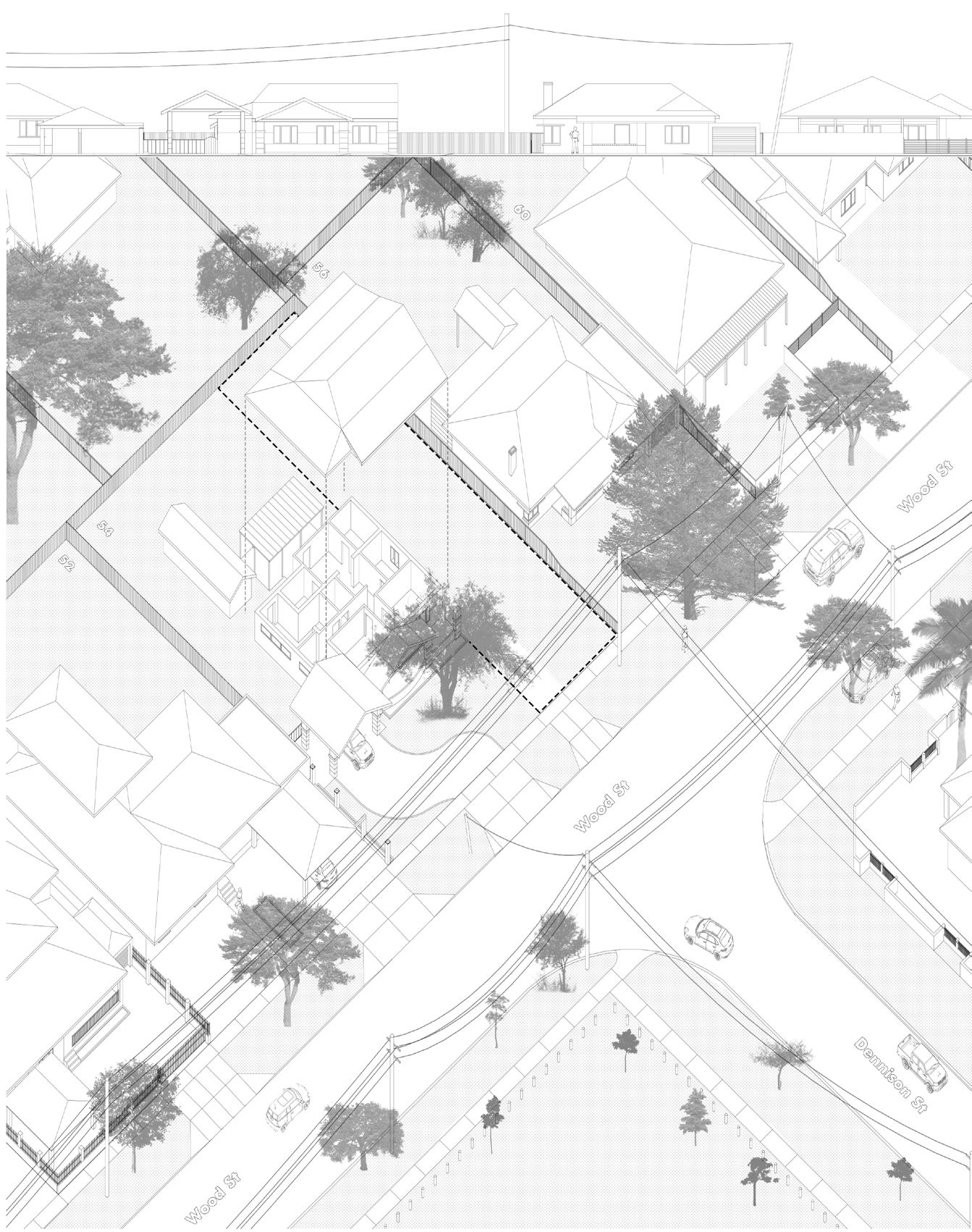 a narrow lot of 370 sqm2 that is vertically sub-divided block of land facing north-east, located below Dennison St of a T-junction across a small open park. The area is predominantly occuipied by inglewood’s traditional dwellings in an array of low front fences allowing houses to be seen from the street with free standing carports and exotic plantings in front gardens that reflect the period of construction. Mature tree are usually found particularly in back gardens to provide tree canopy. The streets have concrete pavements and grass verges on both sides with street trees planted at regular intervals, along the electric power poles.